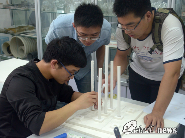 在工作人员的指引下,选手到达指定地点,经过评委老师对比赛内容的简单介绍,开始制作模型。竞赛的模型制作过程要求参赛队伍在指定时间内完成承台成型、基桩布桩、基桩与承台连接及群基桩制作的工作。现场评委在过道中观看选手们的表现。一小时后,各参赛队伍进入模型核查及加载环节。
