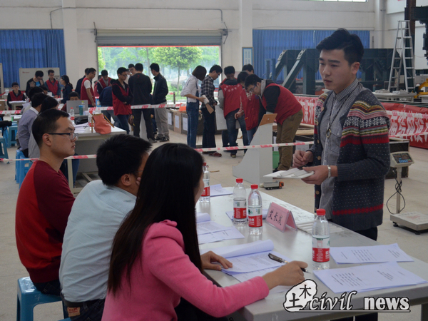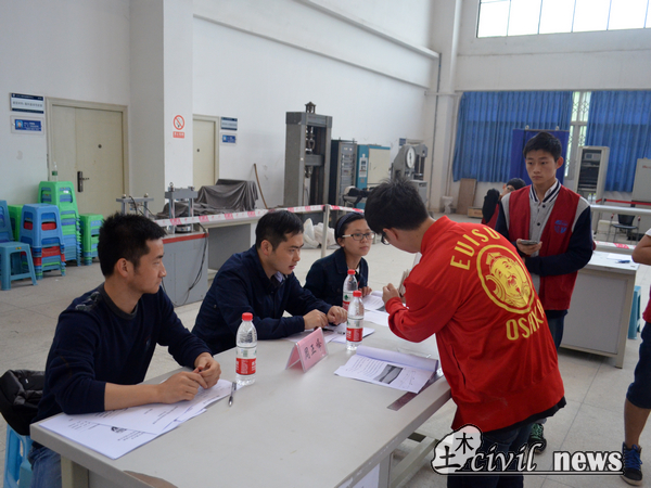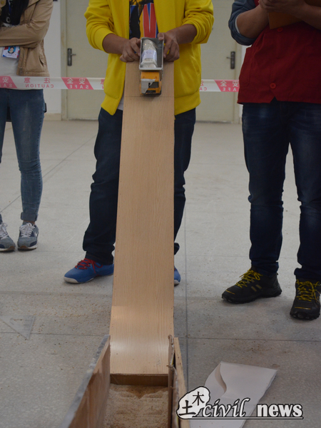 本次比赛,高年级的学生占据多数,但也不乏初生牛犊不怕虎的大一学生。其中一组大一学生,一位选手在答辩区向评委展示自己的理论说明,另两位选手则在加载区内将粗砂、中砂、细砂三种材料依据自己的方案进行模型的制作,由工作人员在一定高度释放空荷载、半荷载、全荷载共三次小车,记录小车停止前在模型上滑行的距离。比赛过程中因为模型制作的线性原因,小车一度侧翻,最后在现场老师的指导下顺利通过了全荷载测试。赛后,评委老师对该组学生大为赞赏,他说道:“身为大一学生,首次参加此类型比赛,单论勇气,都足以让人欣赏,更何况其理论设计,考虑十分周全,资料也十分详细,这点比有些高年级学生做得还好。但是,专业知识还是略有缺乏,日后需要多加了解。”选手们听到评委此番讲话后,深受鼓励。