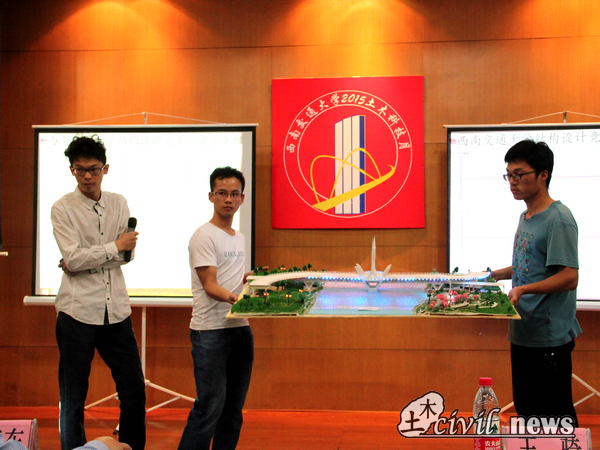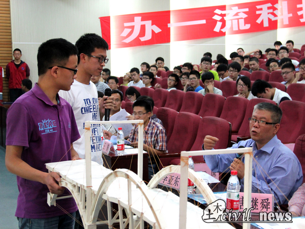 在桥梁造型组方面,由于本次赛题将桥梁周围的场景布置也纳入比赛中,对同学们的模型设计提出了更高的要求。为了吸引各位专家评审的眼球,各组选手使出了浑身解数,无论是从桥梁的设计,还是到周围景观的布置都力求做到尽善尽美。不管是三位土木工科男的《城市之翼》所呈现的精美绝伦的场景布置,还是《城市屋顶》所运用的楚汉文化带来的具有人文气息的娱乐公路两用桥梁,亦或是艺传女选手将东京金门大桥与创新理念结合带来的《白鲸》,这些桥梁造型都给人眼前一亮,引来现场观众的赞叹。不同于桥梁承重组,造型组在结构设计等专业知识的要求方面要低一些,因此吸引了我校许多非土木学院的同学前来参加比赛。各位专家们对他们的到来表示了欢迎,也希望各个学院、专业的同学都能和土木学院的同学们积极交流,碰撞出思想的火花。在看完了各组的造型之后,各位专家首先对他们的辛勤付出与成果表示了赞赏,同时也提出了其中存在的问题。各组设计的桥梁,虽有新意,但是“借鉴”的成分依然很大。我国发展到现今阶段,已经过了以前靠山寨他人设计吃饭的局面,自我创新十分重要。这也是为什么在今年三月的全国“两会”上,李克强总理提出了“全民创业,万众创新”的全新理念。
