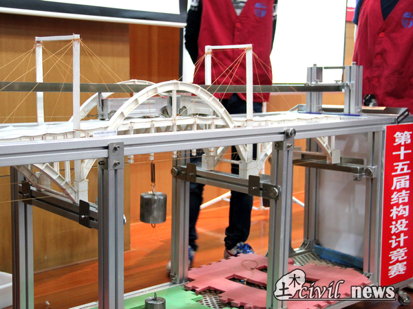 在桥梁承重组方面,各组的作品虽然外观不如造型组美观,但是却巧妙的运用他们扎实的学科基础知识将力学知识的美感带到了比赛中。大到桥梁整体结构的数据计算,小到铅发丝线的预应力添加,选手们将知识与实际模型利用数据精确结合。而现场的模型检测也是面面俱到考虑到模型变形的挠度测试或是桥面平稳性的震动测试,每一项测试都井然有序的经行着而每一次模型的加载都牵动着现场观众的心。测试完后,专家们就模型出现的问题经行了提问,无论是造型设计初期的造型设计,亦或是每个跨度之间的跨度比,每一个问题都一针见血,有时也让选手们感到无从应对。不仅如此专家评审们更是把严苛的要求放到了同学们的模型设计书上,从一个计算公式到一个数据单位,他们对此毫不留情,用专业的眼光为大家诠释了作为一名专业工程师的专业、严谨。无论是桥梁设计、结构方案,还是实用性,专家们都对作品提出了中肯的意见和建议。专家们耐心分析、指导,选手们认真倾听、改进,比赛现场被浓浓的学术氛围所包围。