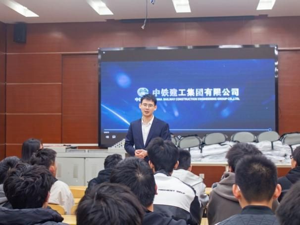 代成山老师为同学们播放了中铁建工企业宣传片,并为同学们详细介绍了中铁建工集团企业历史及发展情况,让同学们对中铁建工集团的企业使命有了更加直观的感受。随后,他针对同学们最关心最好奇的工作属地、工作内容和人才培养机制等就业问题进行解读,并表示企业生涯导师将陪伴同学们大学走过四年的学习生活,在遇到未来职业发展困惑和行业选择迷茫等问题时,同学们可以向导师咨询,导师们将尽己所能为大家答疑解惑。