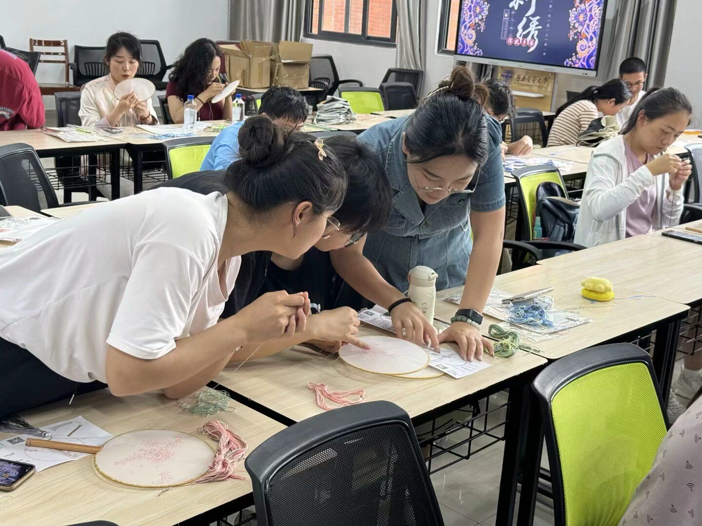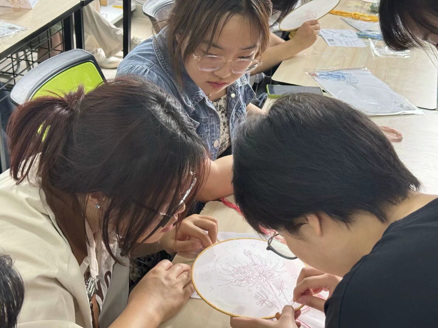 辅导员李雯、李阳阳、柯妍三位老师作为活动嘉宾。杨颖钊老师以蜀绣为例,让活动现场的学生们更直观地了解和学习刺绣技巧。通过让学生亲自体验刺绣的方法,进一步增强了学生的文化自信,丰富了学生的校园文化生活。