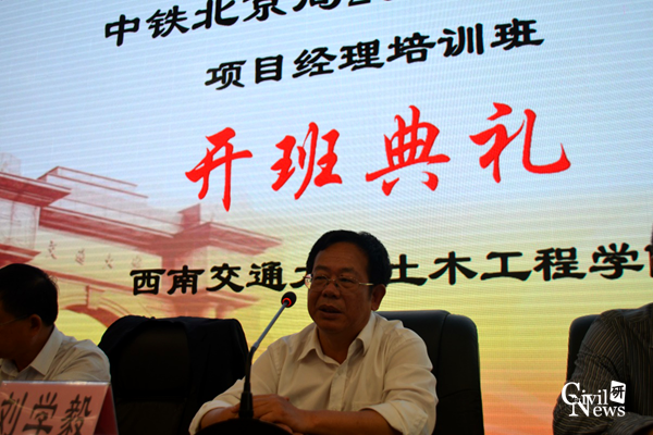 紧接着是中铁北京局党委副书记、纪委书记党秀军致辞,党秀军书记首先肯定了西南交大在工程人技术才培养方面的卓越贡献并对中铁北京局的概况以及近年来的发展情况做了介绍。党委书记指出,随着北京局的快速发展,公司规模与人力资源紧张的矛盾愈发突出。此次培训班的开办是提升人才综合素质的需要,也是提升项目精细化管理水平的需要,同时也有利于相互之间的交流学习。党委书记对八天的培训过程提出了具体的要求,并希望各位项目经理珍惜机会学有所成。