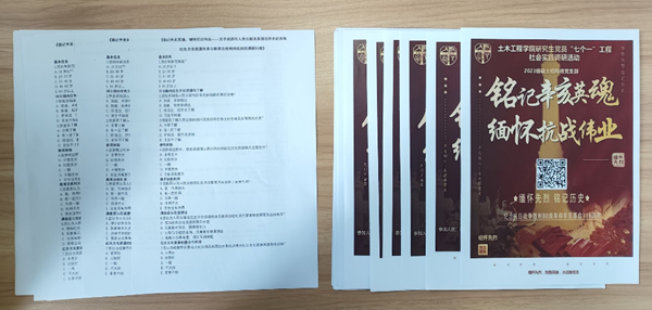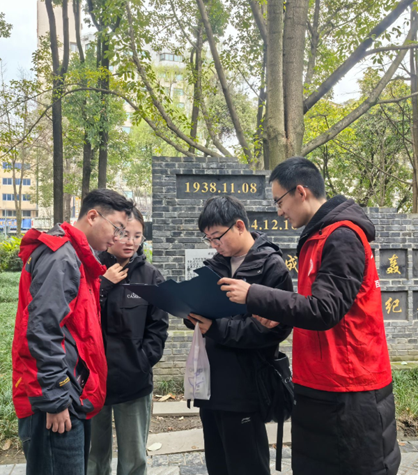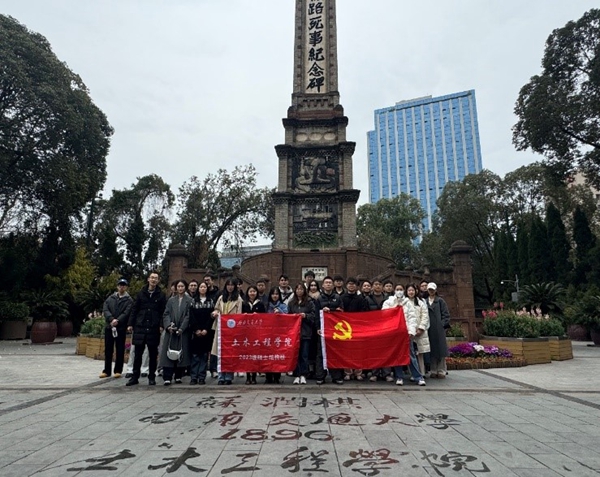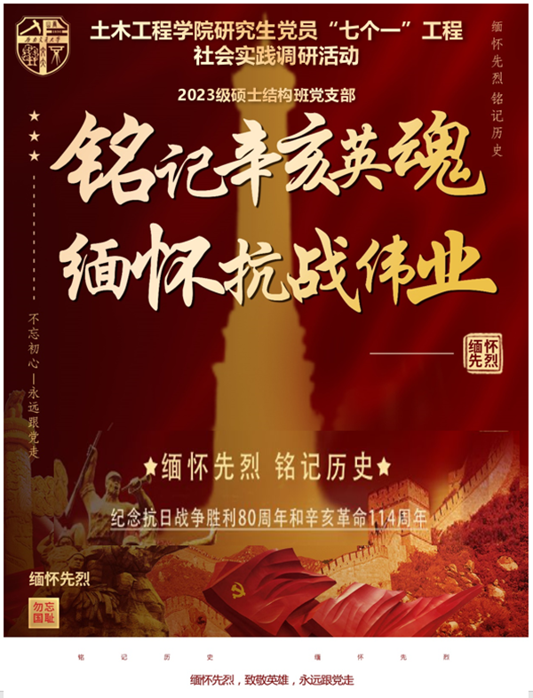 2023级硕士结构班党支部策划了“铭记辛亥英魂,缅怀抗战伟业”主题实践活动,组织党员和积极分子参观成都市人民公园的辛亥保路烈士纪念碑、四川保路运动史事陈列馆、成都1号防空洞、川军抗日阵亡将士纪念碑以及成都大轰炸纪念墙等地。活动前,支部设计红色记忆海报吸引报名。