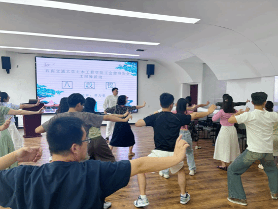 随后,协会会长王楠老师介绍了协会第一次活动——八段锦工间操,八段锦功法是我国经典的传统养生功法之一,注重身心合一,有着丰富的历史内涵和文化底蕴。通过学练八段锦,达到祛病健身,提升教职工工作效率和健康状态。协会邀请了土木工程学院谭力豪老师担任总教练,谭力豪老师主攻民族传统体育方向,曾荣获四川省高校健身气功比赛八段锦普及功法第一名。
