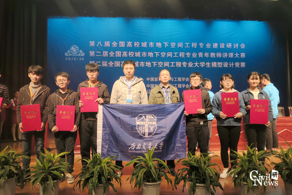 我校师生代表参加了本次大会中的青年教师讲课大赛和模型设计竞赛,均获得了荣誉满载而归。于丽副教授和冯冀蒙讲师参加了青年教师讲课大赛,与来自全国多所高校的50余名教师同台竞技,经过精心准备和激烈角逐,于丽副教授讲授的《地下铁道》课程喜获本次讲课比赛特等奖,冯冀蒙讲师讲授的《隧道工程》课程荣获本次讲课比赛三等奖。郭春副教授指导6名本科生分为两个参赛队参加了模型设计竞赛,同学们克服重重困难,从72支参赛队中脱颖而出,其中全力引队获得二等奖、戴明昊队获得优胜奖。