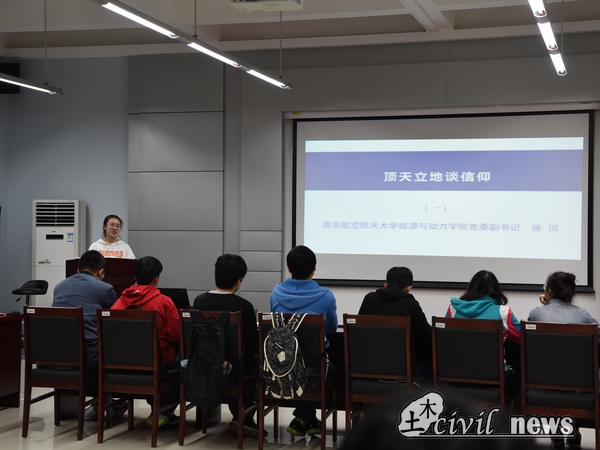 下午两点半,周四党课大讲堂活动正式开始。首先,在李书记的带领下,全体与会人员一同观看由南京航空航天大学能源与动力学院党委副书记徐川主持的党课视频《顶天立地谈信仰》。视频中,徐川以风趣幽默的脱口秀带来了一堂别开生面的党课。徐川从“一封尖锐犀利的思想汇报”、“那些多元纷纭的入党动机”及“谈谈独立思考与国际视野”三个方面进行了讲解。观看视频期间,各党员都认真地观看视频,记录重点。