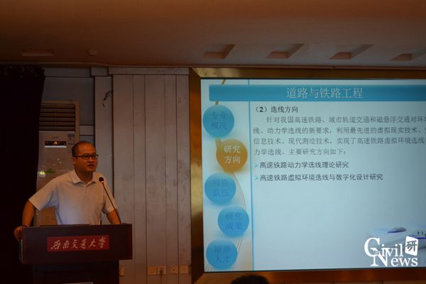 道路与铁道工程系杨荣山副教授介绍了轨道、选线、路基方向的的突出成果以及近年来研究生招生情况和就业情况;地下与隧道工程系副主任晏启祥教授对学科现状,研究方向及近几年的科研业绩和学术成果展开介绍;桥梁工程系主任李永乐教授简要介绍了性吧