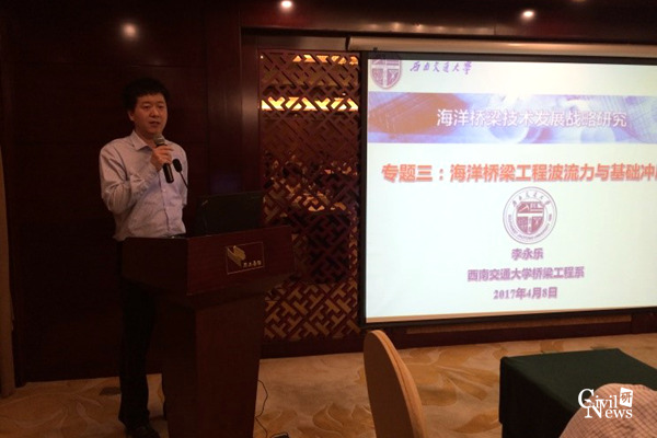 李永乐教授作了题为“海洋桥梁工程波流力作用与基础冲刷”的专题报告,对海洋桥梁桥址区波浪特性、波浪对桥梁结构的静动力作用、海啸及波浪的冲击效应和海洋环境桥梁基础冲刷等四个方面进行了汇报交流。同时将咨询建议分为政府管理层面、行业应用层面和学术技术层面分别进行了阐述。