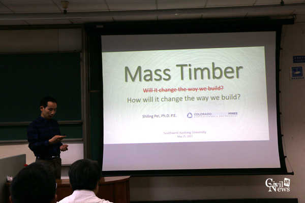 5月25日上午,美国科罗拉多矿业大学土木与环境工程系博士Shiling Pei(裴适龄)应邀于我校逸夫馆4407B教室举办了一场关于重木结构在现代建筑中的研究与运用的学术报告。我校性吧
