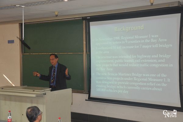 Chai教授详细介绍了Benicia Martinez桥的修建加固过程和后期的健康监测工作,该桥具有大跨度、宽桥面的特点,采用轻骨料混凝土浇筑,大大减轻了桥梁自重。但是轻骨料混凝土徐变问题突出,使该桥后期出现了比较严重的变形,Chai教授对此作了深入研究并与同学们展开探讨。