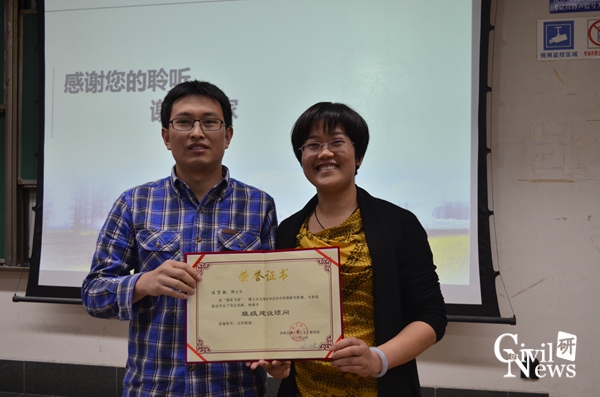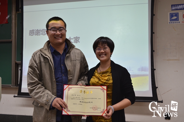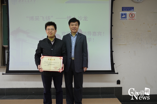 首先由祝院长做开场致辞,他强调研究生与博士生作为国家高素质人才在现阶段需注意多思考,多规划。随后祝院长介绍了参与此次活动的优秀毕业生代表梅大鹏博士与王森荣博士的个人经历,并为他们颁发“班级建设顾问”荣誉证书。