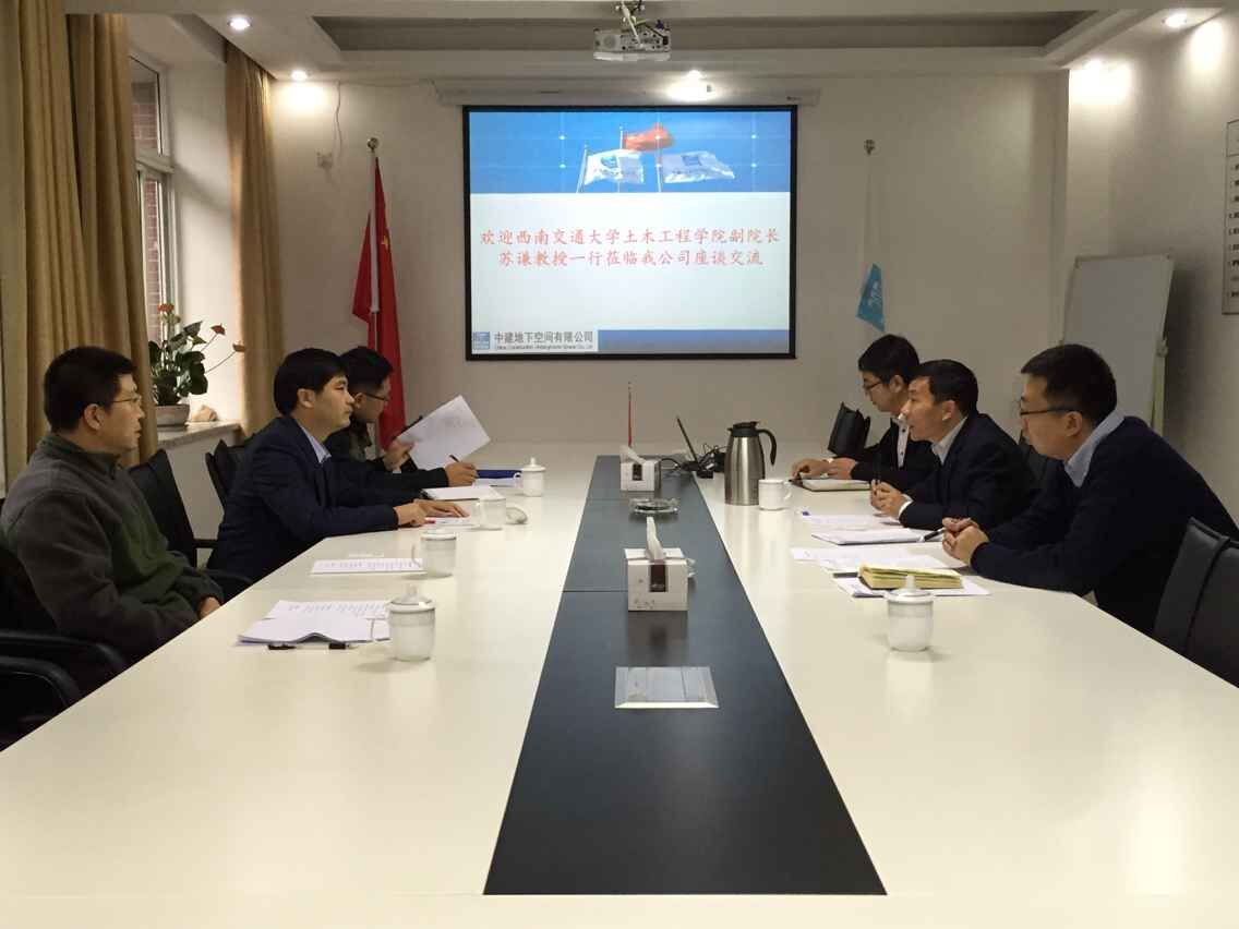 2015年11月27日上午,由性吧 副院长苏谦教授带队,周晓军教授,蒋雅君副教授,李伦贵副教授一行4人来到中建地下空间有限公司,就合作共建四川地下空间产业技术研究院,与中建地下空间有限公司总经理薛国洲,副总工郑立宁,市场投资部主任胡英鹏进行了座谈。