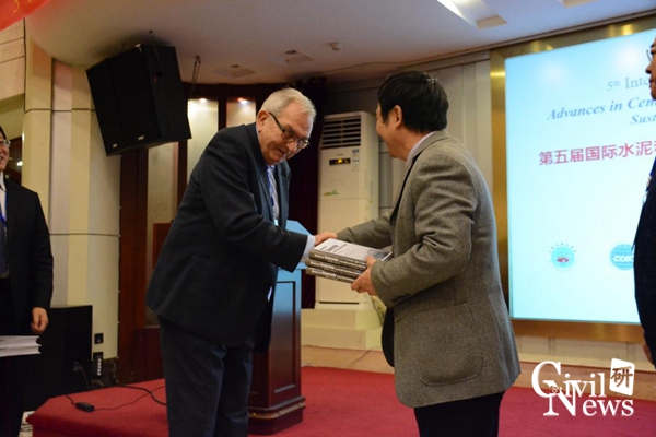 议程六为闭幕式,在隋同波教授的带动下,Prof. Robert Flatt、Mr. Haynes以及Mr. Per Jahren发表了他们对于参加此次论坛的感想,并表达了对水泥和混凝土可持续展望。同时,叶跃忠教授、东蓝星公司刘自力总裁等与会人员也表达了他们对于此次活动的赞许。最后,隋同波教授把他与Per Jahren著作的《History of Concrete——A very Old and Modern Material》赠送与我校。