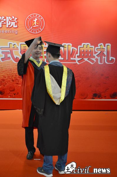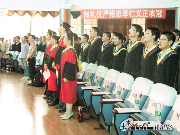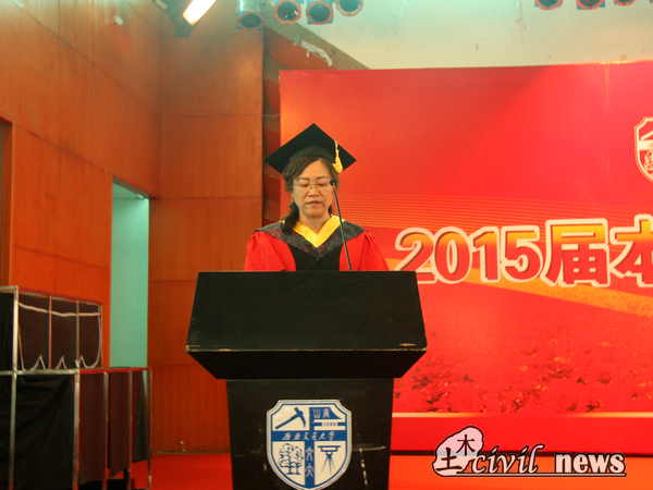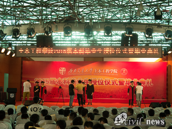 2015届本科毕业生授位仪式暨毕业典礼。参加本次授位仪式暨毕业典礼的领导和嘉宾有:土木学院院长、授位委员会主席高波教授,土木学院党委书记、授位委员会委员钱永久教授,土木学院副院长、授位委员会委员易思蓉教授,土木学院副院长、授位委员会委员苏谦教授,土木学院行政办主任周曦,土木学院岩土工程系主任马建林教授,土木学院桥梁工程系副主任唐继舜教授,土木学院铁道工程系副主任刘昌清教授,土木学院岩土中心主任、地下工程系教师代表杨其新教授,土木学院建筑材料教研室主任叶跃忠教授,土木学院防灾减灾研究所主任姚令侃教授,导师代表:刘艳、王耀琴、崔圣爱及土木学院各位党委委员、指导老师、辅导员们。整个仪式由性吧