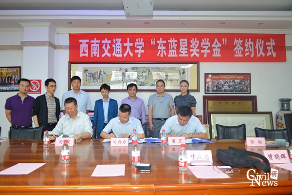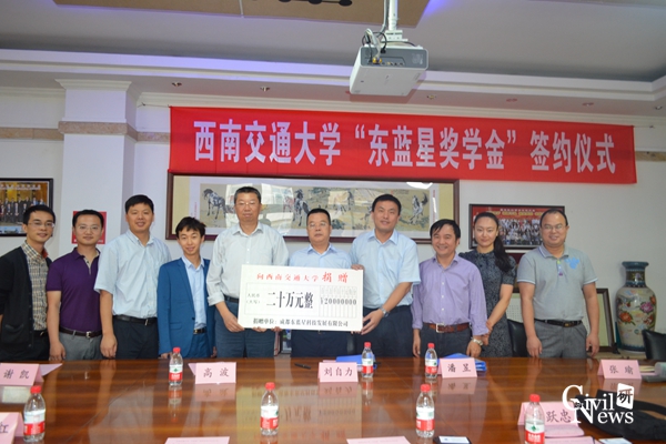 “东蓝星奖学金”签约仪式在土木馆1208会议室举行。成都东蓝星科技发展有限公司董事长刘自力、副总经理刘应虎、销售部经理谢凯、行政部经理张瑜,性吧
