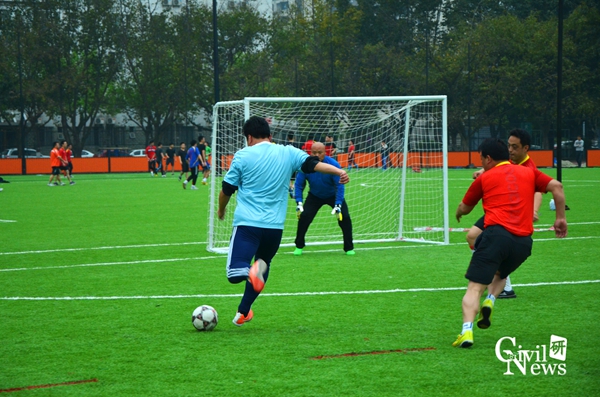 第三届教职工足球赛C组小组赛在九里校区体育场举行,土木学院队在此迎战小组劲敌机关(体育部)队。机关(体育部)队中人才济济,有数位从事本科足球课教学的一线教师,他们身体素质过硬,基本功扎实,实战经验丰富,是不可小觑的对手。而土木学院队的队员都是对足球运动十分热爱的年轻教职工,在前三场小组赛中取得了2胜1平的优异战绩,有着良好的竞技状态。因此,本场比赛水平很高,看点十足,最终赛果扑朔迷离。