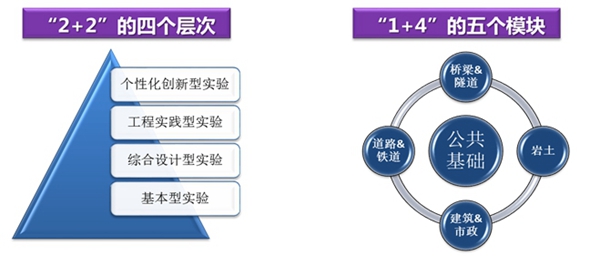 实验中心遵循“激发兴趣、夯实基础、强化实践、引导创新、突出能力”的原则,着力构建出与大类人才培养模式相适应、具有交通土建特色、着眼实践能力和创新意识培养的新型实验教学体系。新的实验教学体系以“系统性、综合性、层次化、模块化”为特征,在实验类别上划分为纵向“2+2”四个层次(基本型实验、综合设计型实验、工程实践型实验、个性化创新型实验),在实验内容上横向划分为“1+4”五个实验模块(1个公共基础模块加上4个专业模块)。