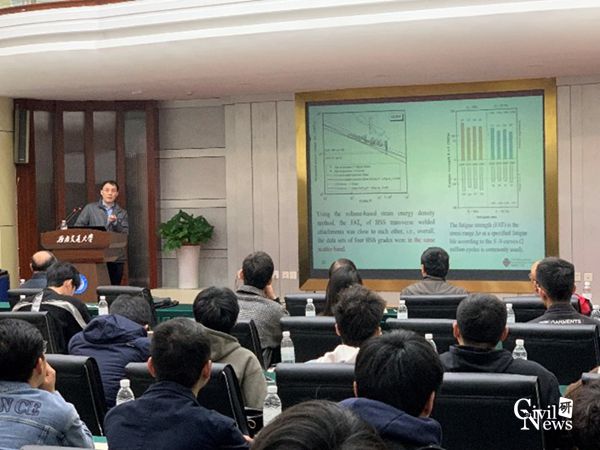 院长蒲黔辉教授、副院长陈嵘教授、祝兵教授、卜一之教授和徐幼麟教授等学院领导和师生代表在现场聆听了报告,大会由陈嵘副院长主持。首先,蒲黔辉院长代表学院对赵晓林教授的到来表示热烈欢迎,并详细介绍了赵晓林教授的科研和工作经历。随后,赵晓林教授就超高强钢的疲劳和FRP加固的研究进展进行了详细的报告。赵晓林教授首先介绍焊接超高强度钢的疲劳,其中包括焊接超高强度钢的关键问题,焊接超高强度钢的疲劳裂纹萌生和扩展以及疲劳评估方法。然后介绍如何使用纤维增强聚合物加固疲劳载荷作用下的钢桥,就其加固机理、加固方式及相关工程应用进行了详细报告。