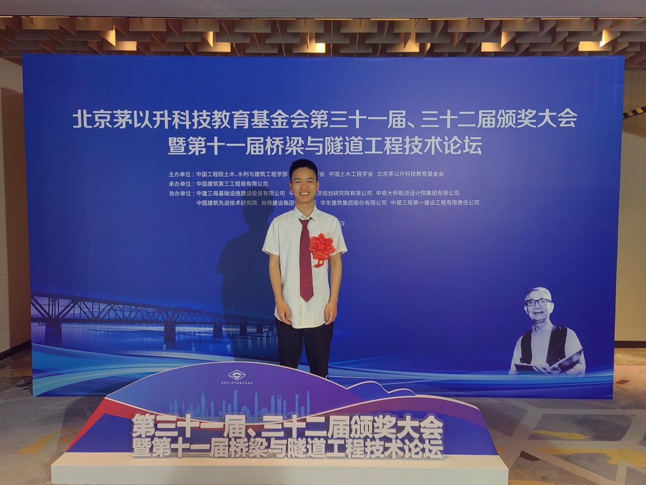 2019级土木工程专业本科生陈斌获2022年度茅以升科学技术奖——工程教育学生奖。