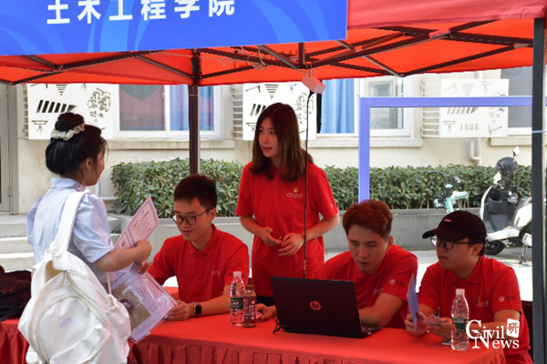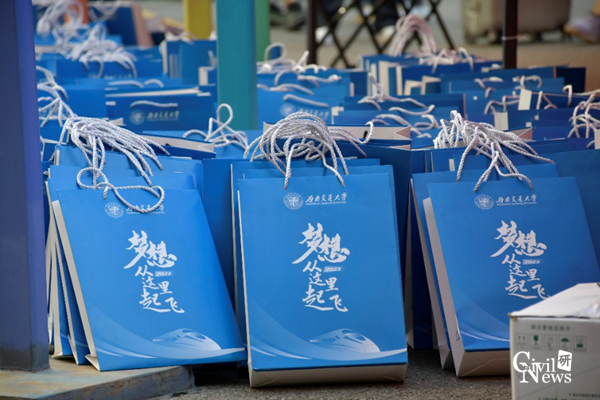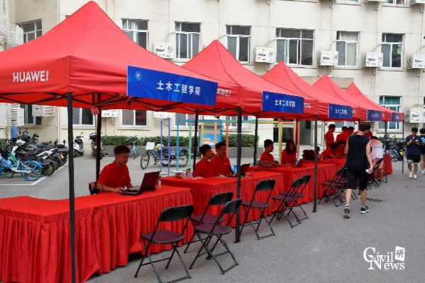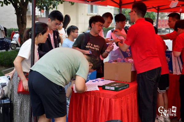 迎新流程清晰且工作高效,新生们首先进行录取通知书以及身份验核,之后便可依次领取一卡通、宿舍钥匙以及新生大礼包。工作人员们对新同学的问题一一解答,耐心指导,尽管顶着炎炎烈日,却丝毫没有懈怠。