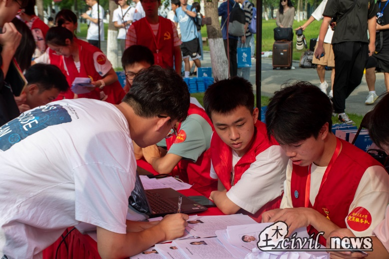 晨光熹微之时,一群红色的身影已经在学院迎新点位上忙碌着。新生物资清点摆放,件件明晰;报到流程熟悉掌握,样样落实。志愿者和党员服务队的同学们各自分工,在迎新点位严阵以待,在辅导员的引导下有条不紊地进行新生身份核验、物资发放等工作。