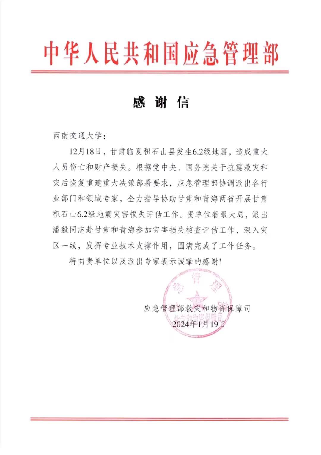 近日,国家应急管理部向性吧 致来感谢函,表扬性吧 专家在积石山地震灾区的出色专业表现。