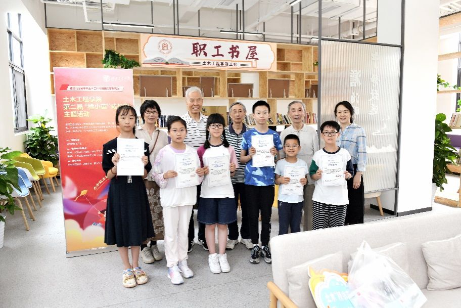 随后活动进入实践环节。桥小苗们在桥梁工程专业老师的启发下,开始了木桥的设计和搭建。他们思维活跃、勇于实践,完成了多个桥梁模型作品的制作,并经受了加载检验。全体参会家长和老师们作为评委点评了每一位桥小苗的作品。多座木桥轻松通过了10kg荷载的检验。刘学信教授等老教师向桥小苗们颁发了证书和奖品,并预祝他们六一儿童节快乐。活动现场气氛热烈,妙趣横生,充分体现了百年土木精神的传承与未来蓬勃发展的希望。