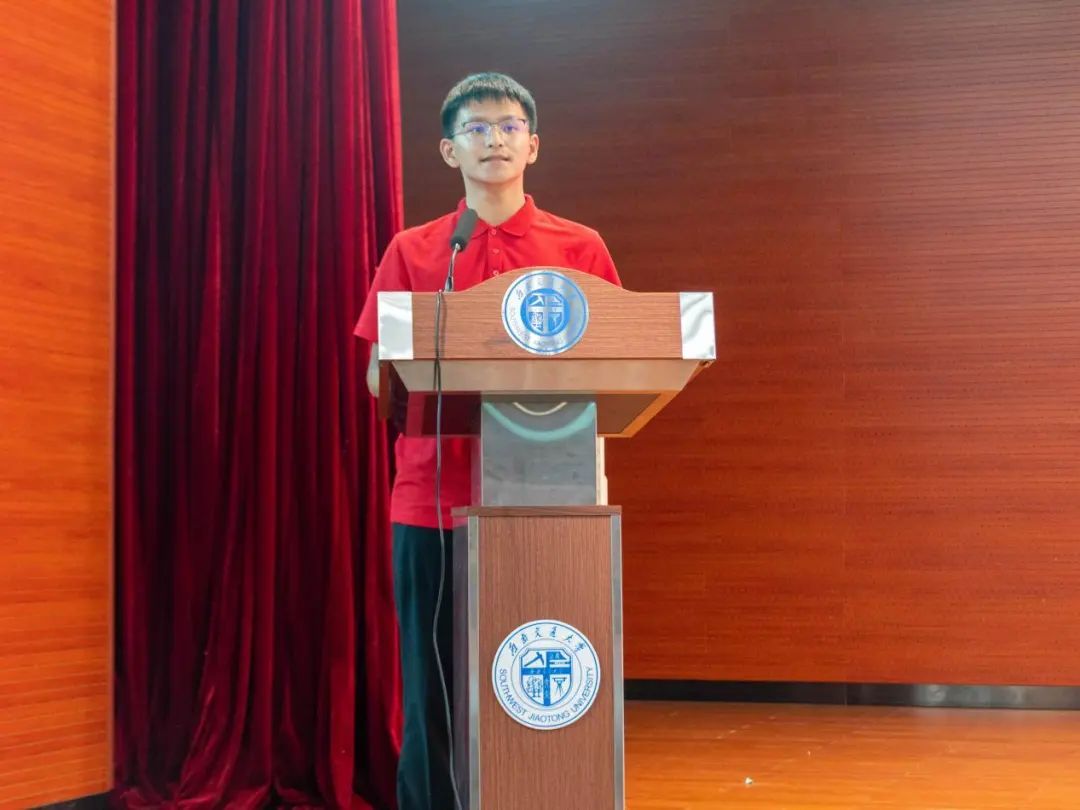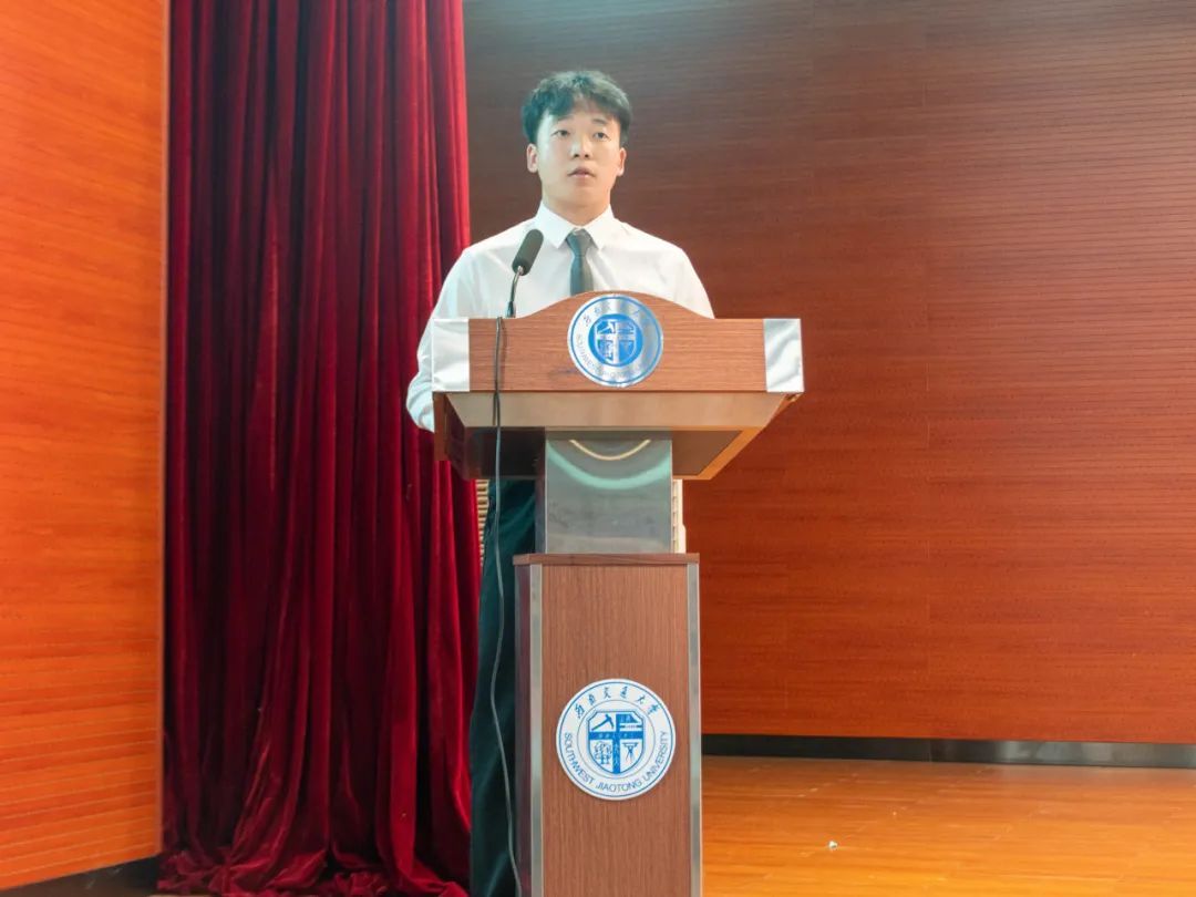 2021级的宋雨宸作为优秀学生代表发言。他详细讲述了自己在大学期间参加各类竞赛和学生组织的成长历程,并从自身经历出发,号召新生“少一些推脱,多一些担当;少一些盲从,多一些探索;少一些安逸,多一些拼搏”,做好规划,努力耕耘,相信同学们能够在土木学院收获知识,成就未来。
