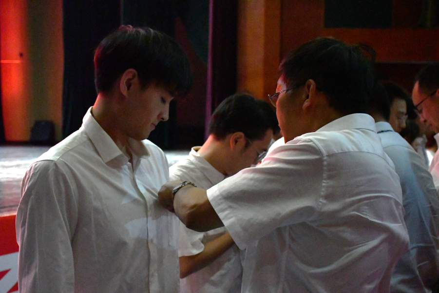 随后,在庄严的氛围中,全体新生佩戴土木学院院徽。
