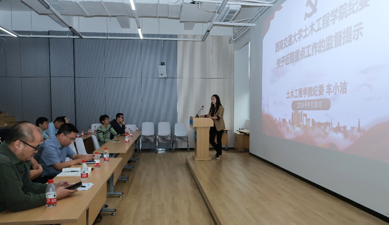 党委副书记兼纪委书记车小洁同志对学院党委和纪委的近期重点工作进行了提示。车书记从师德师风建设和纪律工作两个方面强调了教师工作的重要性,表示各个教工党支部要做好党纪学习教育总结、认真学习贯彻党的二十届三中全会精神。她还充分传达了“纠'四风'树新风”的专题精神,指出各系室要加强2025年推免工作中的纪律要求,同时要进一步规范学校仪器设备资产的使用管理。