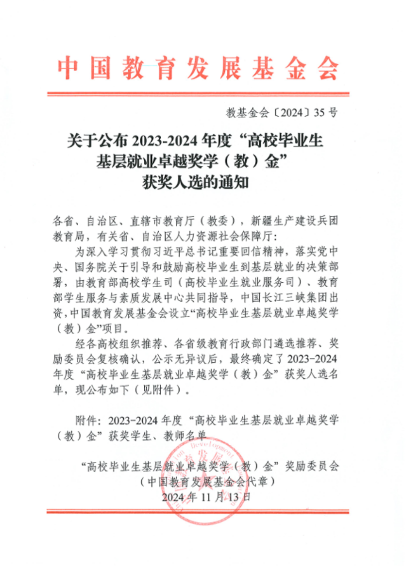 “高校毕业生基层就业卓越奖学金”由教育部高校学生司(高校毕业生就业服务司)、教育部学生服务与素质发展中心共同指导,中国长江三峡集团有限公司出资,中国教育发展基金会特设,旨在深入学习习近平总书记重要回信精神,贯彻落实党中央、国务院关于引导和鼓励高校毕业生到基层就业的决策部署,奖励赴基层就业创业并做出突出业绩的普通高校毕业生。2024年,全国共有398名优秀高校毕业生获得奖励。此次性吧
