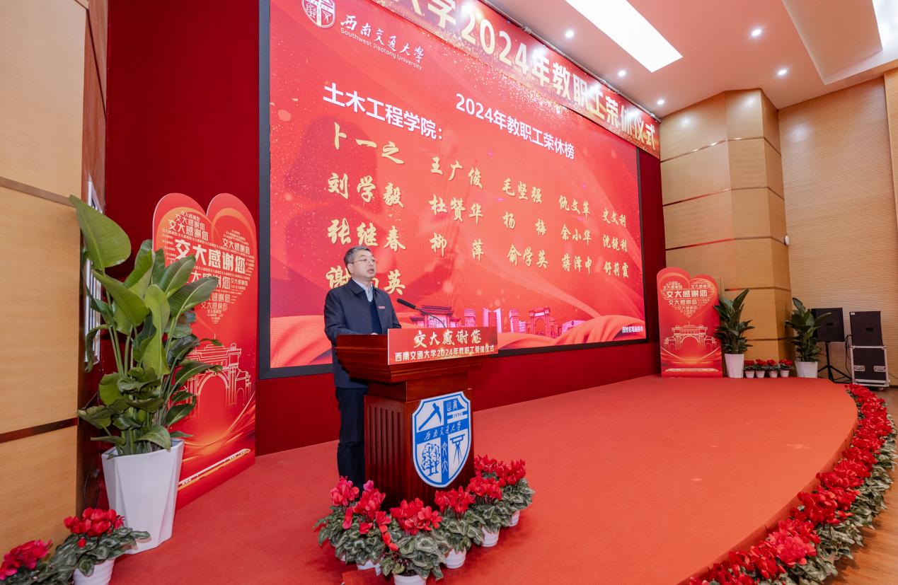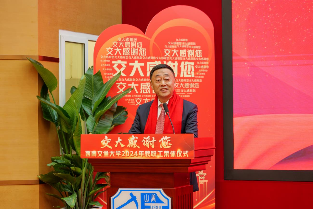 仇文革教授作为荣休教职工代表作了《燃尽最后一滴蜡烛,给隧道增添光明》的发言。他深情回顾了在交大求学和工作的峥嵘岁月,毕业留校后,他响应学院号召,奔赴衡广复线大瑶山隧道建设一线,在那里,他找到了自己的信念:再好的实验室也赶不上工地,要用双脚做学问。直到今天,仇文革教授仍每年奔赴工地几十次,继续发挥余热。最后仇教授寄语母校寄语未来,在这个中华民族伟大复兴和百年未有之大变局的时代,在这个科技日新月异,AI飞速发展的时代,在地壳中修建经纬纵横的隧道网络“环球地铁-Global metro”不是梦想。交大人要凝心聚力奋发有为,再创百年辉煌!在发言结束时,仇教授隔空“比心”,并喊话“I love you交大!”,表达了对交大的感激之情和美好祝愿。