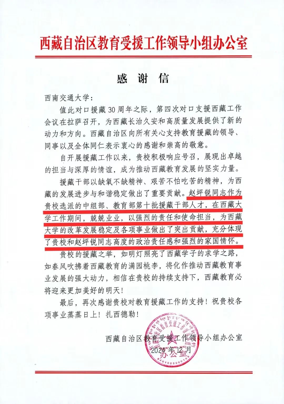 赵坪锐教授在对口支援西藏工作中的积极贡献表示感谢。感谢信中指出,援藏干部以缺氧不缺精神、艰苦不怕吃苦的精神,为西藏的发展进步与和谐稳定做出了重要贡献。