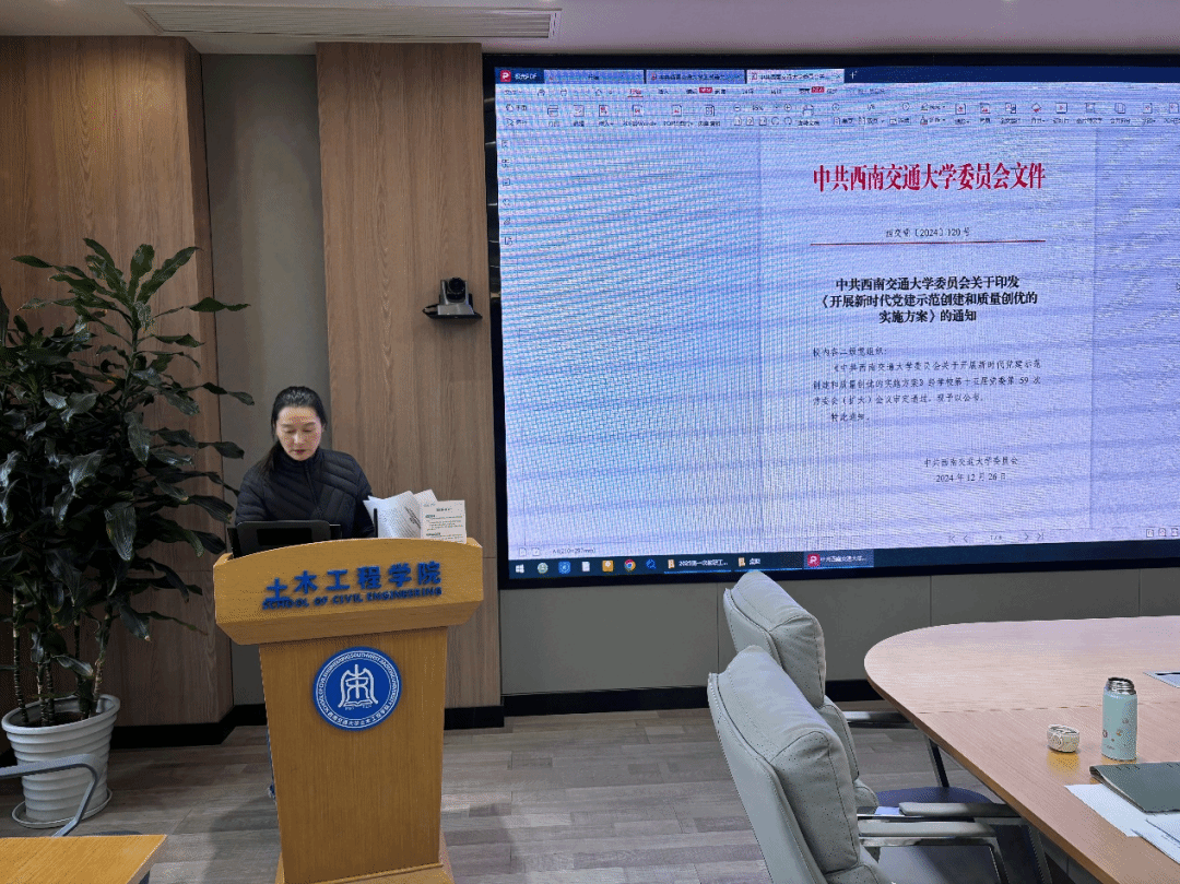 首先甘泉主任带领大家学习习近平总书记关于奋斗的语录;随后依次由熊麟老师在会上布置了基层党支部2024年度组织生活会的相关事宜;车小洁副书记带领学习《开展新时代党建示范创建和质量创优的实施方案》并布置申报工作;王楠老师带领学习《开展基层党组织“1+ 1”合作共建行动的实施方案》并布置申报工作。郑江书记带领学习了《土木工程院长2024年度工作报告》。车小洁副书记和刘萍副书记通报近期工作情况。郑江书记听取与会人员对《性吧
