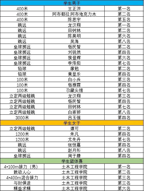 在本次运动会中,土木学院师生表现优异,成绩斐然。学生们奋勇争先,凭借出色发挥,学院斩获学生甲组总成绩桂冠;教职工们同样不甘示弱,最终教师组总成绩位列甲组第四名。并且土木学院还荣获“道德风尚奖”团体荣誉,充分彰显了学院师生优良的体育道德风尚。