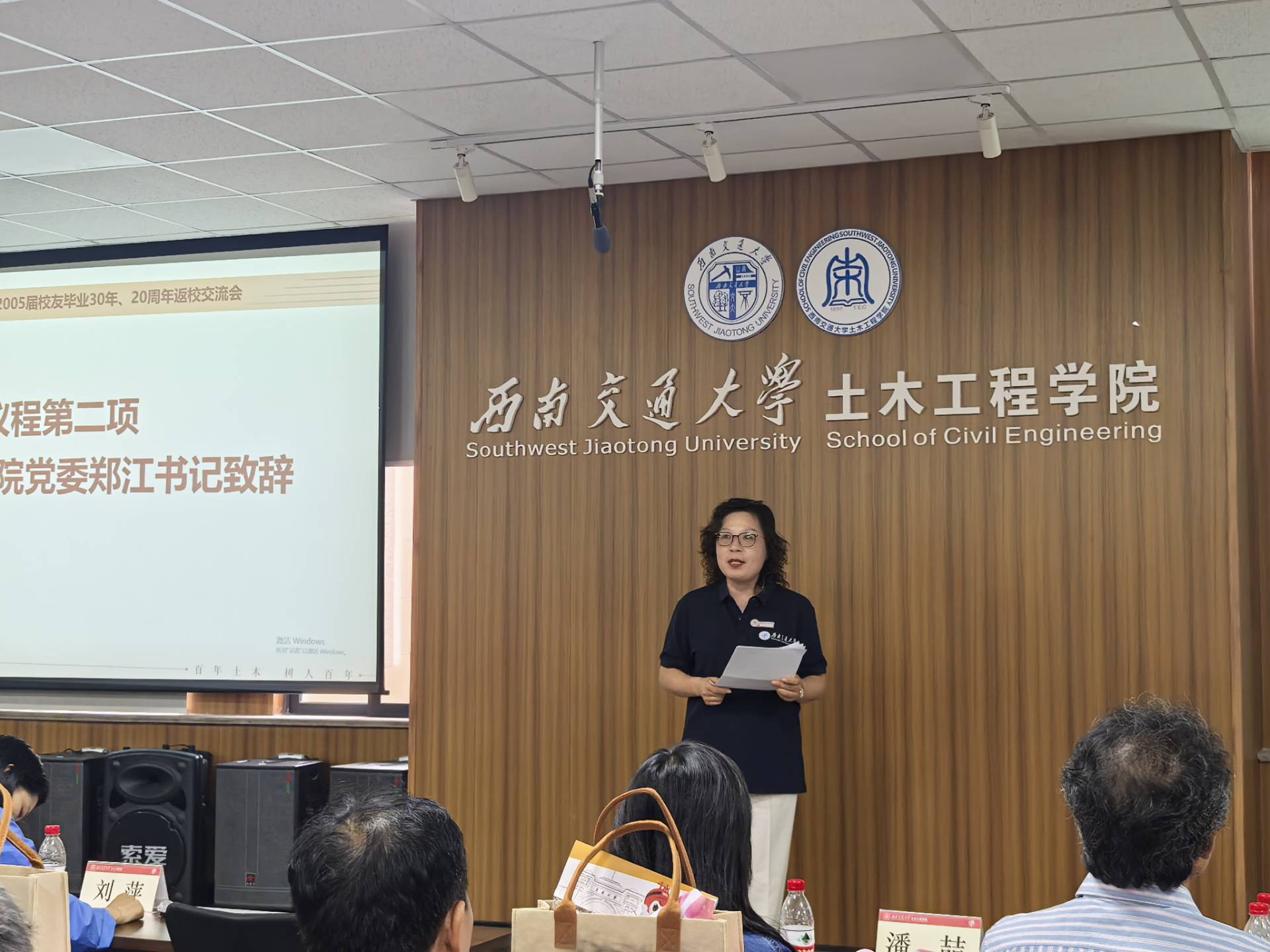 党委书记郑江致辞,她分别从“欢迎,报告,致敬,邀约,约定”五个关键词出发,一是热烈欢迎校友们归来;二是报告学院30年来的建设发展历程;三是向校友们在各自领域取得的成就致敬,并向设立万路通桥梁奖学金的桥梁91 级校友魏伯忠、参加学院“我为母校添一张书桌”项目并冠名工作间的地下与隧道工程91级校友和为母校认捐树木的铁道及道路工程91级校友表示感谢;四是向校友们发出合作同行邀约;五是约定青春不散场并对校友们表达美好祝福。