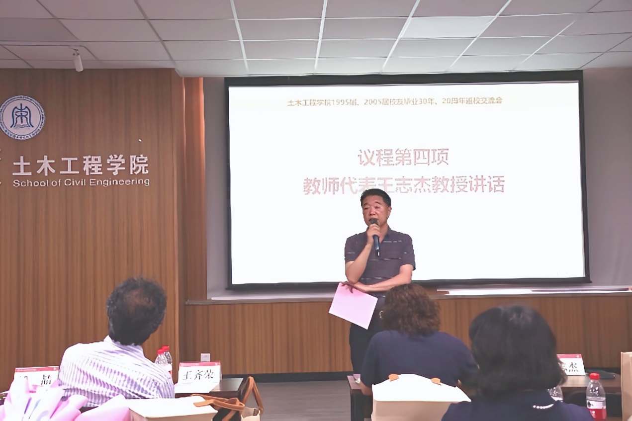 院情视频使校友们更充分了解到学院近年来在教学、科研、人才培养等方面的新进展。接着,教师代表王志杰教授上台讲话,他深情回忆了与同学们相处的往昔岁月,感慨时光飞逝,也对校友们送上了殷切祝福和期望。