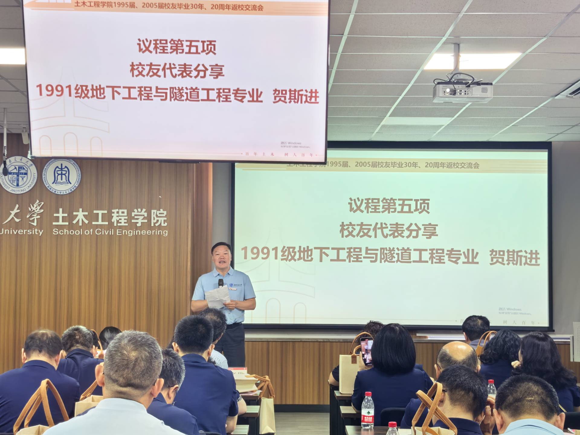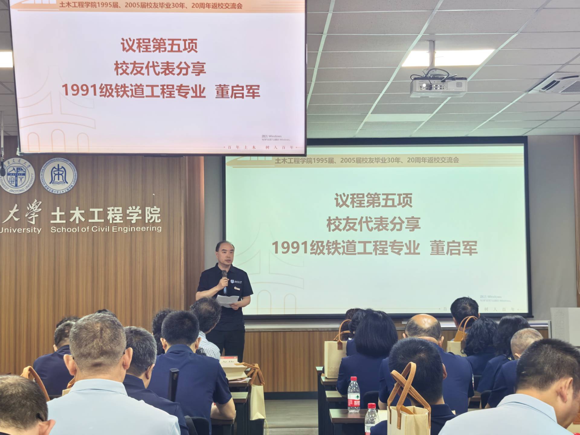 校友代表分享环节将会议氛围推向高潮。1991级桥梁工程专业、地下工程与隧道专业、铁道工程专业等校友代表依次发言。他们讲述了毕业后的奋斗历程,表达了对母校培养的感恩之情,同时也为学院的发展建言献策,校友代表们真挚的话语,引起了现场校友们的强烈共鸣。