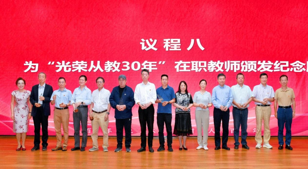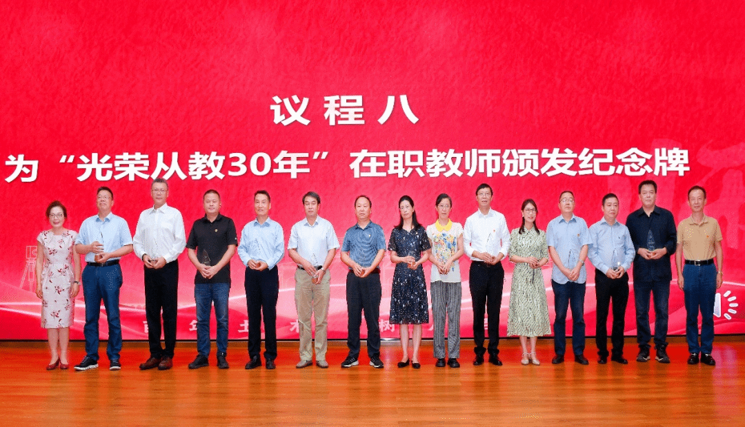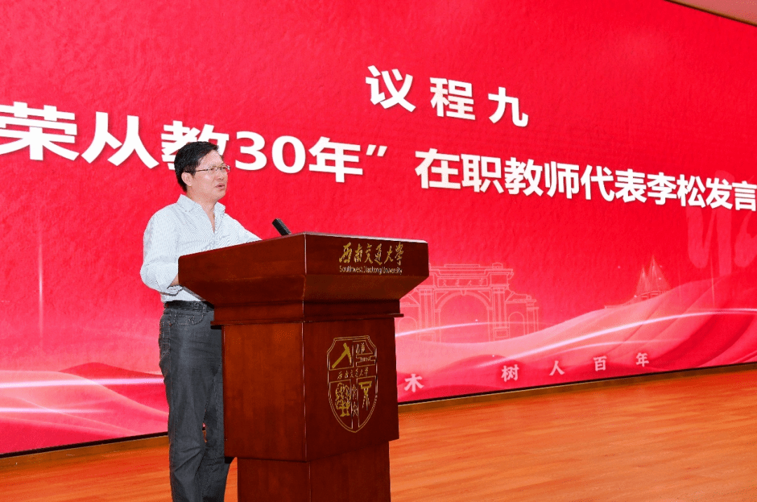 表彰会第二篇章——“岁月流金”,致敬坚守教学科研一线,追求卓越的优秀教师。于丽副院长宣读“光荣从教30年”在职教师名单,赵世春、黄充、李松等32位教师获此殊荣。随后,蒲黔辉院长和郑江书记为“光荣从教30年”教师颁发镌刻着名字的纪念牌。李松教授作为光荣从教30年教师代表发言,他谈到学校发展带来的机遇与挑战,教师是一个国家繁荣昌盛不可或缺的中坚力量;“师者”二字背后,不仅是对知识的敬畏,更是对国家未来的担当。随后,大会向廖海黎教授等7位年度退休教师致以敬意,感谢他们为学院发展作出的长期贡献。