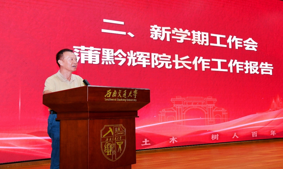 大会的第二阶段,由蒲黔辉院长作学院新学期工作报告。首先,他代表学院党政班子向获奖教师表示祝贺,向“光荣从教30年”教师表示感谢,以及向新入职教师表示欢迎。蒲院长强调教书育人、立德树人是教师的第一要务,充分肯定了学院全体教师在人才培养、科研攻关上取得的成绩,希望更多教师以为国家培养顶尖人才为己任。蒲院长通报了近期国工实转序进展,招生报到、土木馆改造等工作。指出学院将加大支持力度,以“专业焕新”计划推动有组织地学科建设,促进青年教师的职业成长;用心用情为教师提供更好的教学和科研环境,以更好的育人场域服务学生成长。