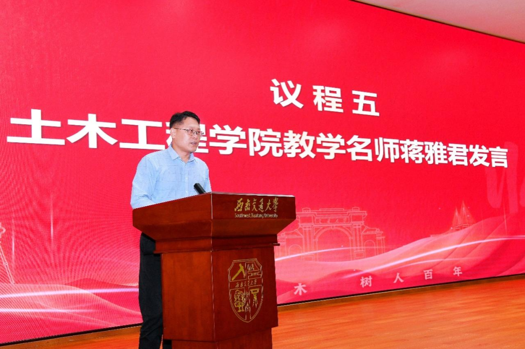蒋雅君教授作为获奖教师代表发言。他首先对学院授予的荣誉表达了衷心感谢,并分享了自己“厚基础、重实践、求创新”的核心教学理念。他表示,未来将以此次荣誉为新起点,探索智能建造、智慧运维等新技术与传统课程的融合,继续深耕教学一线,为学院培养人才贡献自身力量。