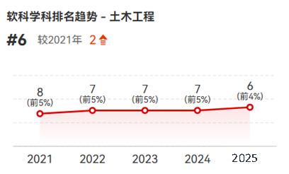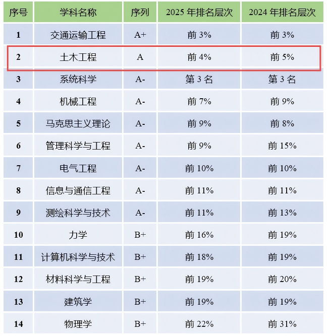 “土木工程”学科从2024年的全国第7位攀升至第6位,稳居A类,跻身全国前4%!
