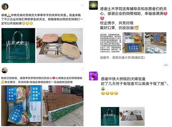 与此同时,中铁大桥院全体校友情系蓉城、心系学子,为学院全体硕博研究生捐赠2650个保鲜饭盒,积极助力学校疫情防控工作,校友们纷纷表示“母校是永远的家,作为交大土木人,校友们时刻不忘母校的培养之恩,通过捐赠物资支持母校工作,希望与全体师生同心戮力,共克时艰。”