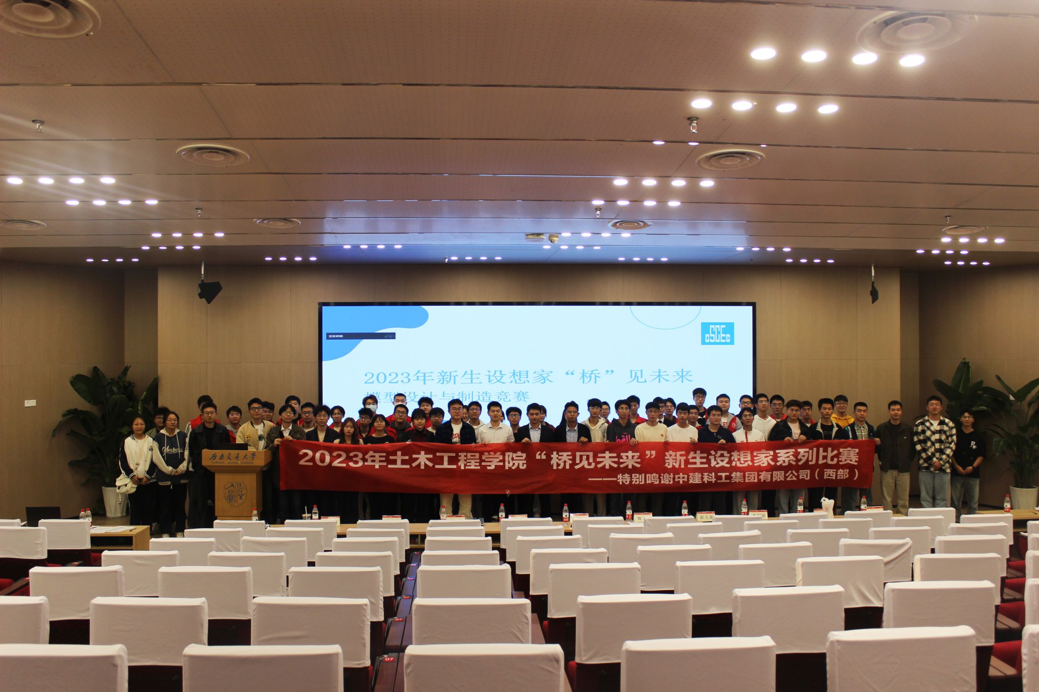 “桥见未来”新生赛决赛在我校犀浦校区图书馆二号报告厅举行。中建科工四川公司天科创智项目总工程师、学院青年讲师团成员张炳宏,中建科工集团四川公司人力资源管理部人力专员姚军,学院辅导员老师李江怀,薛人铭,谢宇清,贾璇琦,李策,郭哲维,李阳阳出席决赛现场。