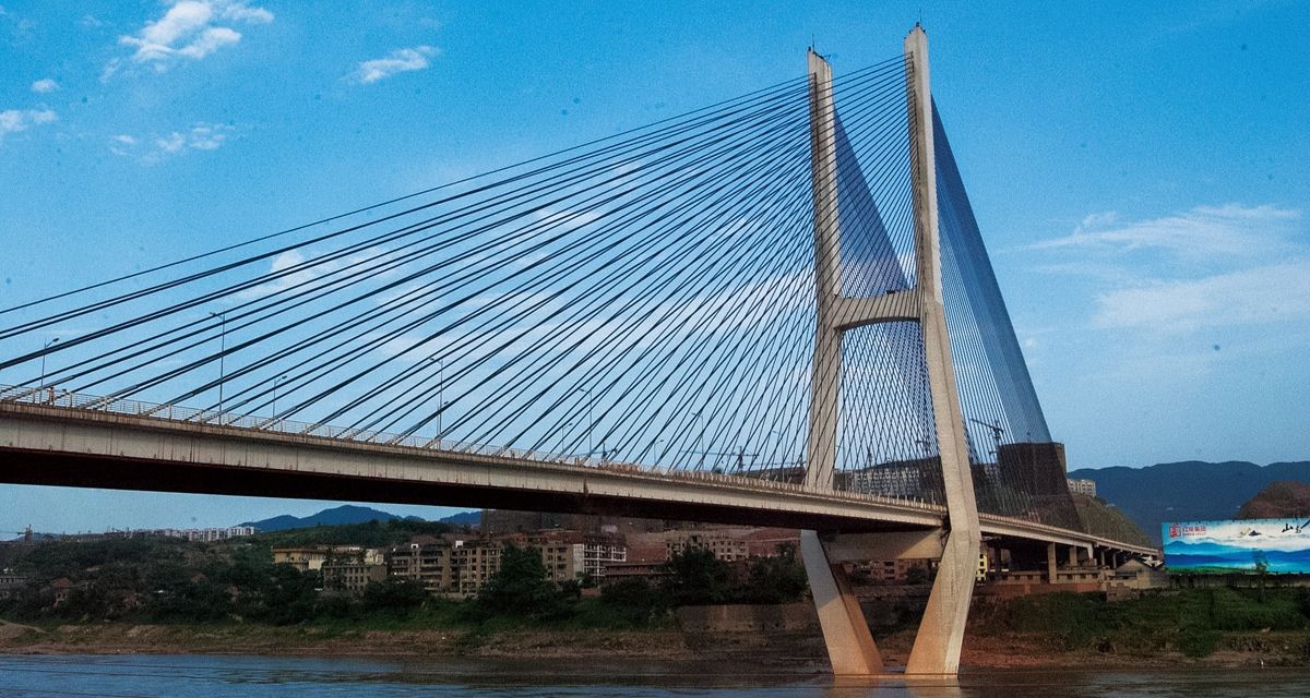 金沙江中坝大桥于2003年11月竣工,是我国首座大跨度独塔PC(即钢筋混凝土)梁环氧喷涂钢绞线斜拉桥,是宜宾市总体规划中三条城市快速道路中的一座跨越金沙江的特大型桥梁。桥梁总长965.02m,其中主桥434.5m(为252+175m预应力砼独塔斜拉桥)引桥530.52m(北岸为377.76m,南岸为152.76m),为跨径25m简支空心板,桩柱结构。桥面净跨:30m,设计时速:60Km/h,计洪水频率:1/300,地震裂度:VII度,设计风速:28.6m/秒。