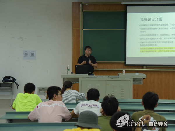 本次土木讲坛一开始,王老师首先介绍了竞赛题目。参赛小组应主要选择在成都预设背景下进行虚拟桥梁设计,满足桥梁使用功能以及和当地环境的协调,接着着重指明作品中必须体现成都地区存在的实际景观,不可虚构。老师细致详尽的介绍让在座的同学们对赛题有了更深一步的认识。