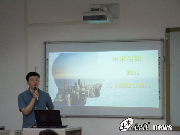 校友的罗毅先生微笑着上台。他首先从各大地产公司的目标到国家对房地产方面的政策向大家分析了目前建筑方面的前景大观。他指出,国家政策要求的“民有所居”以及现在地产经济在国民经济的大占比决定了房地产产业的重要性,同时城镇化的不断演变与新时代建筑的翻新需求让建筑行业会长时间火热。接着他又通过举例房地产行业的经济总量的增长与恒大等企业的飞速发展来表现土木行业的发展势头,也让房地产产业为夕阳产业的说法不攻自破。