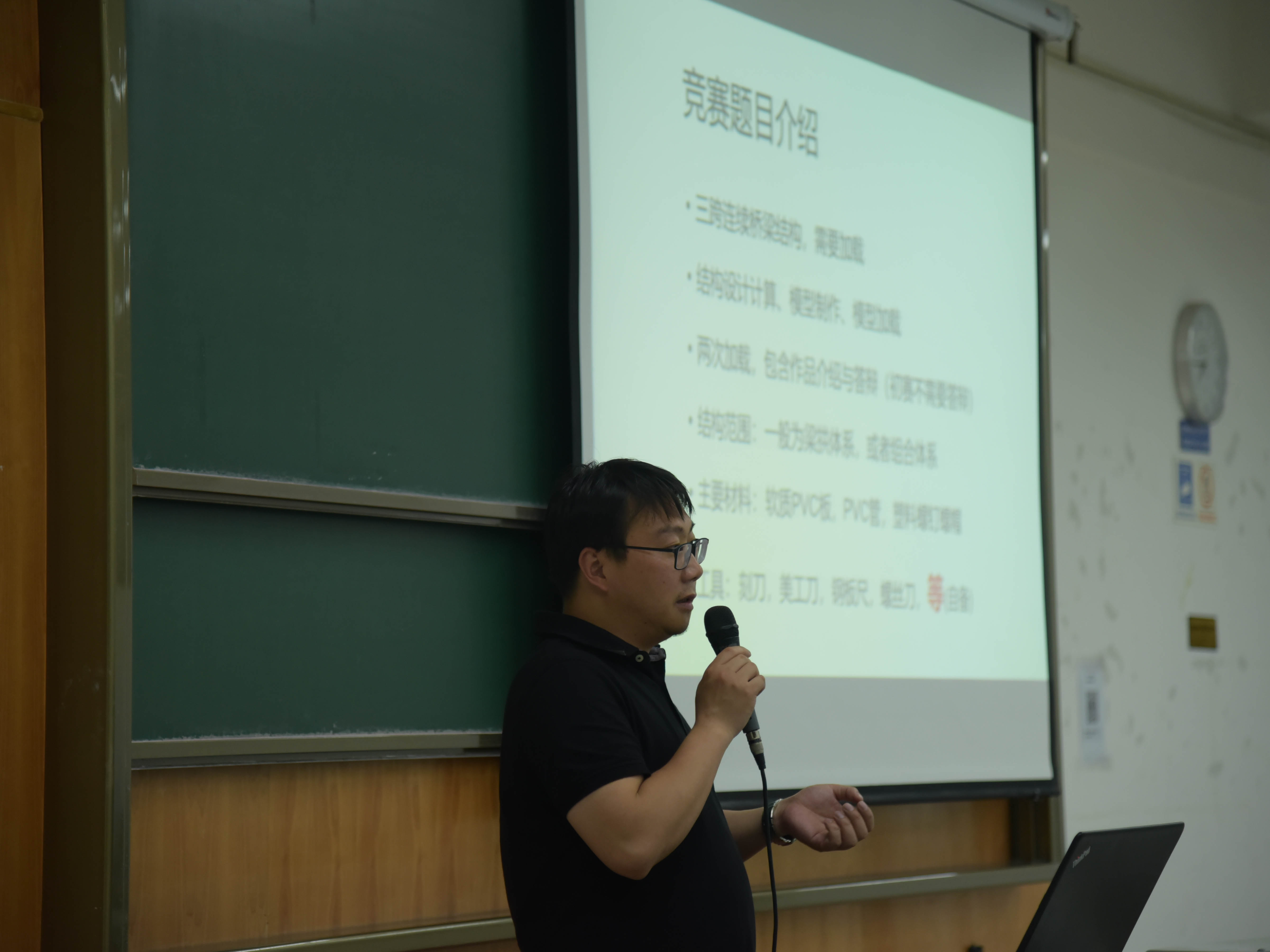 王老师首先介绍了竞赛题目。本次竞赛的题目是设计三跨连续桥梁结构。模型加载共两次,包含作品介绍与答辩。而结构范围一般为梁拱体系,或者组合体系。主要材料有:软质PVC板,PVC管,塑料螺钉螺帽等。王老师特别强调不允许使用任何形式的胶。