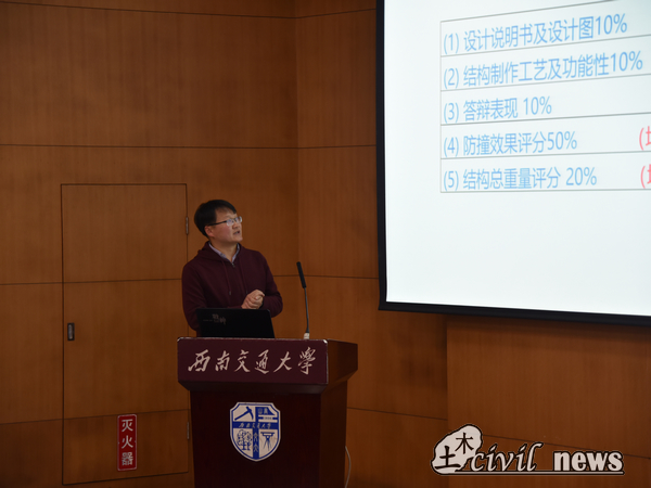 最后,各项目组命题老师进行了第十九届结构设计竞赛命题的介绍。老师们用精炼易懂的语言对竞赛命题以及评分机制等各个方面进行了较为全面的介绍,使得在座同学们更深一步了解土木科技月赛事,更激发了同学们参与其中去切身感受的兴趣。